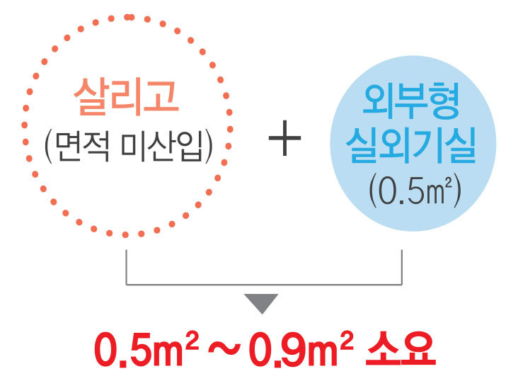 • 살리고플러스* : 외부실외기실 인접 설계를 통해 별도의 실외기실 공간 절약(약 1.3㎡ 이상 절감 효과)