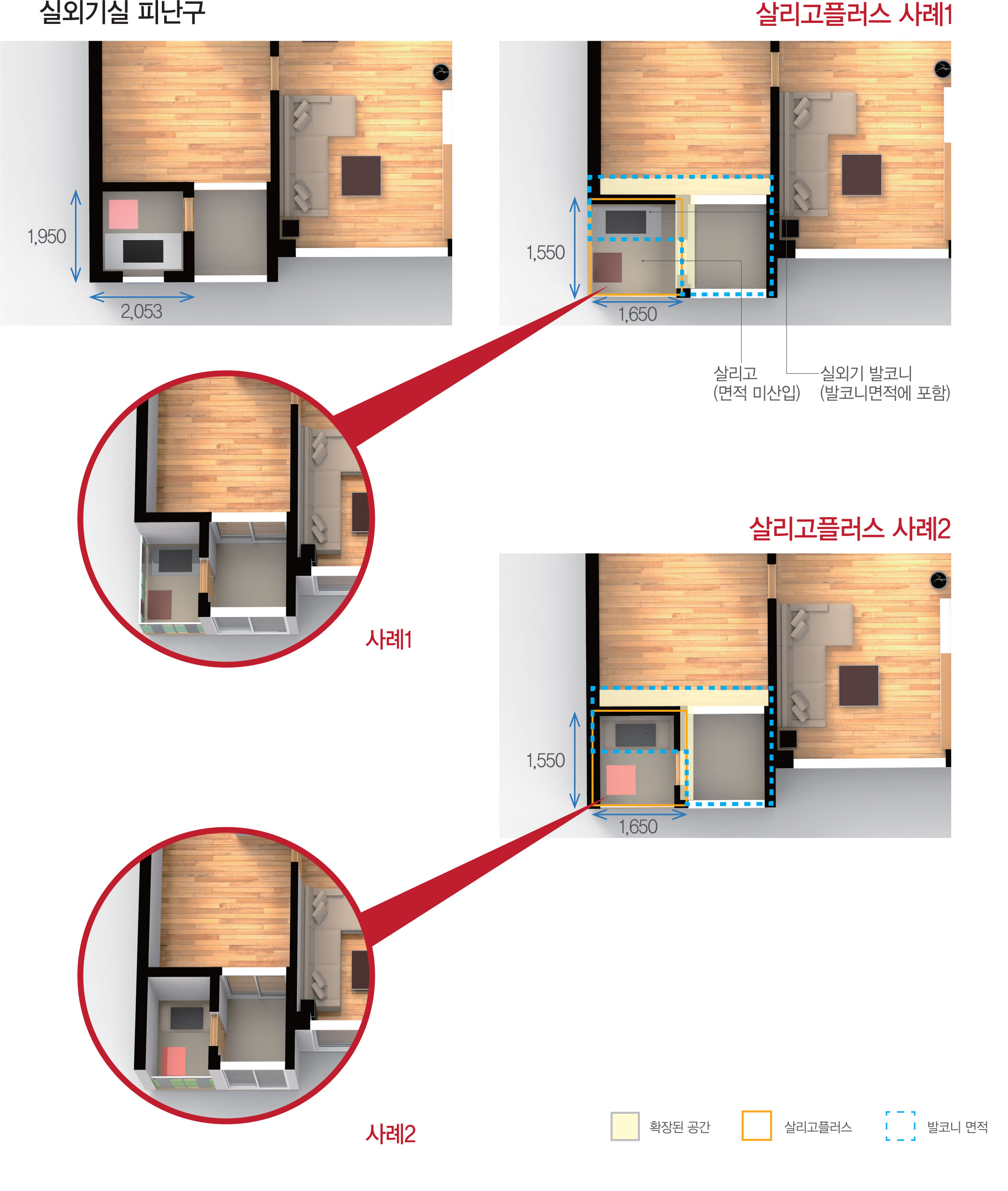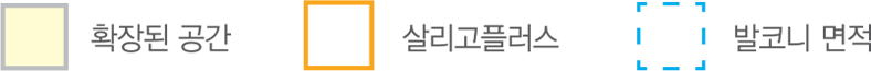 • 살리고(1.2㎡)는 건축면적, 바닥면적에 산입되지 않으므로 발코니 제한 등에 구애 받지 않고 자유로운 평면 배치 가능