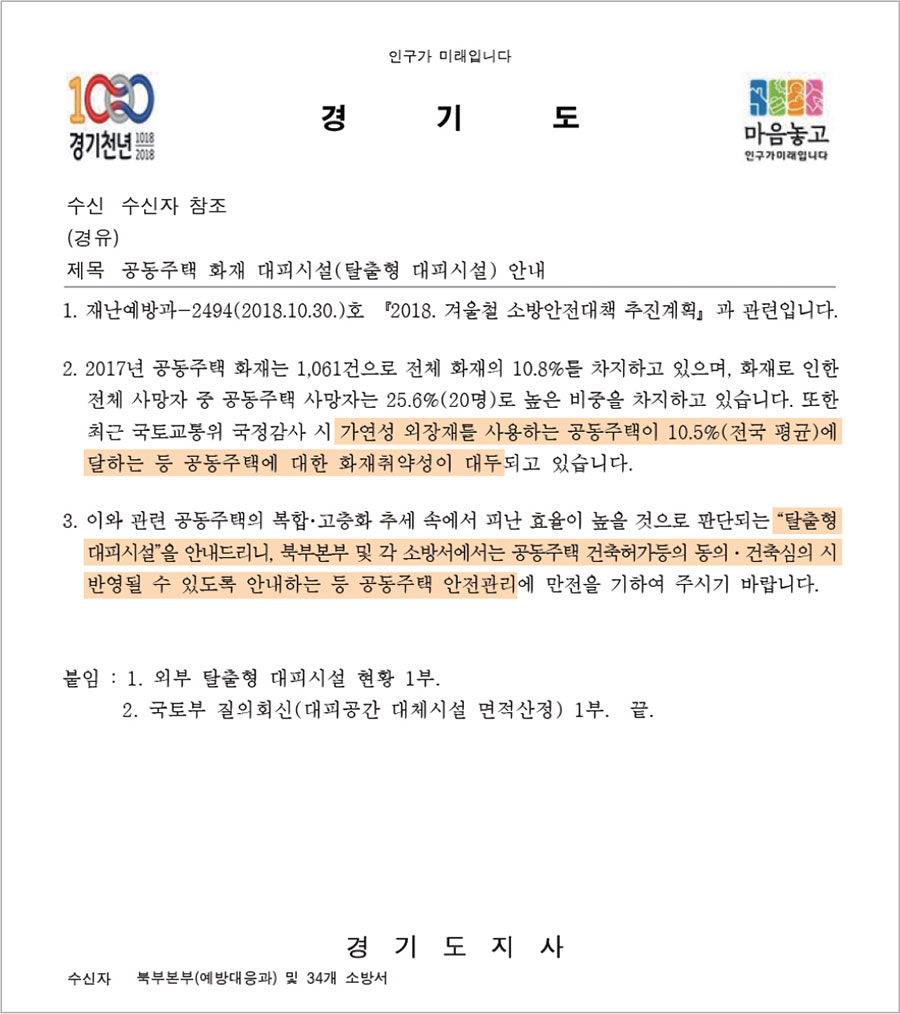 경기도 도내 31개 지자체, 경기도시공사 및 관할 34개 소방서에 탈출형대피시설 소개 및 권고 공문 발송(18.11)