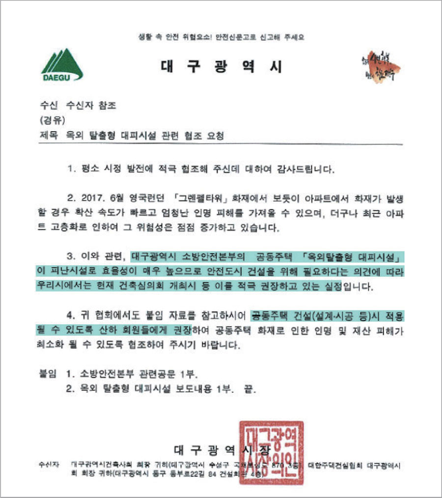 대구광역시 2017년 6월 그렌펠타워 참사를 계기로 고층아파트에 대한 건축 심의 시 탈출형대피시설 설치를 적극 권장 (17.08)