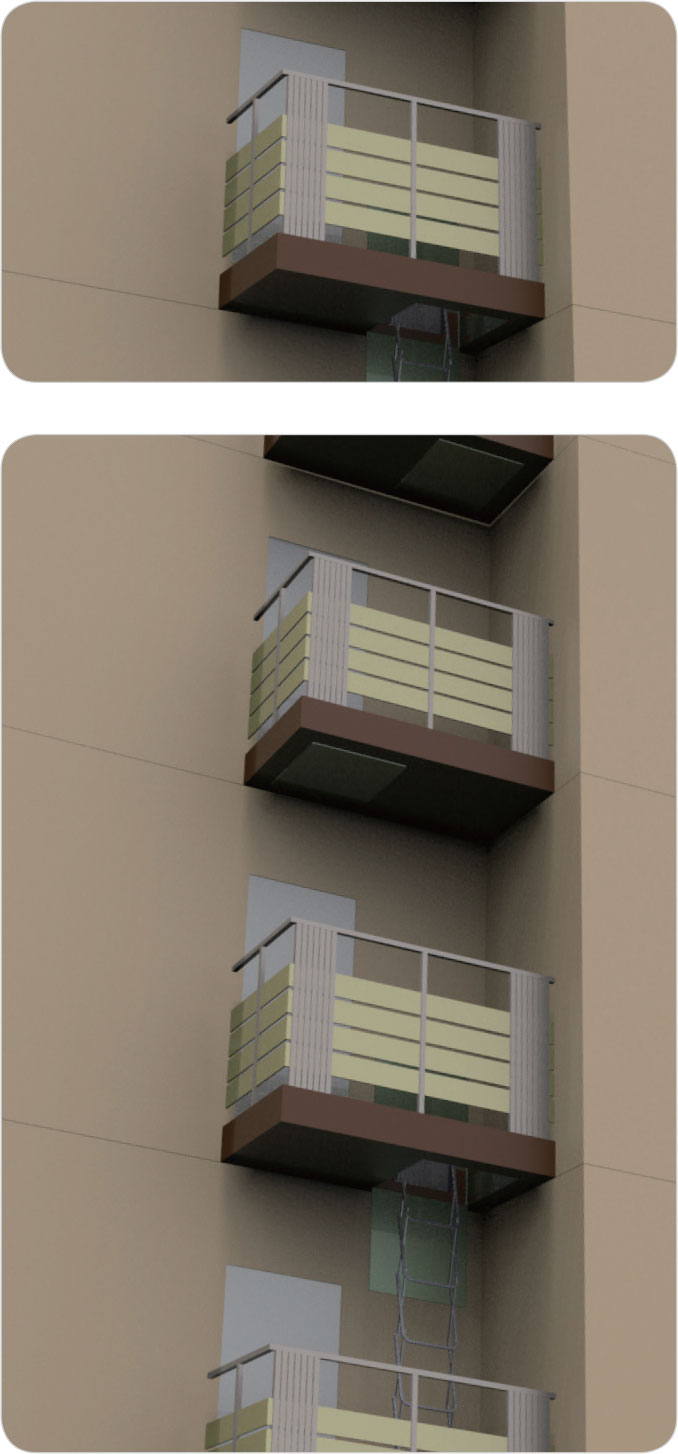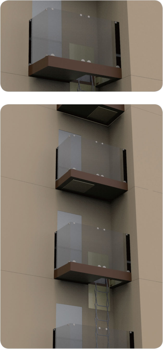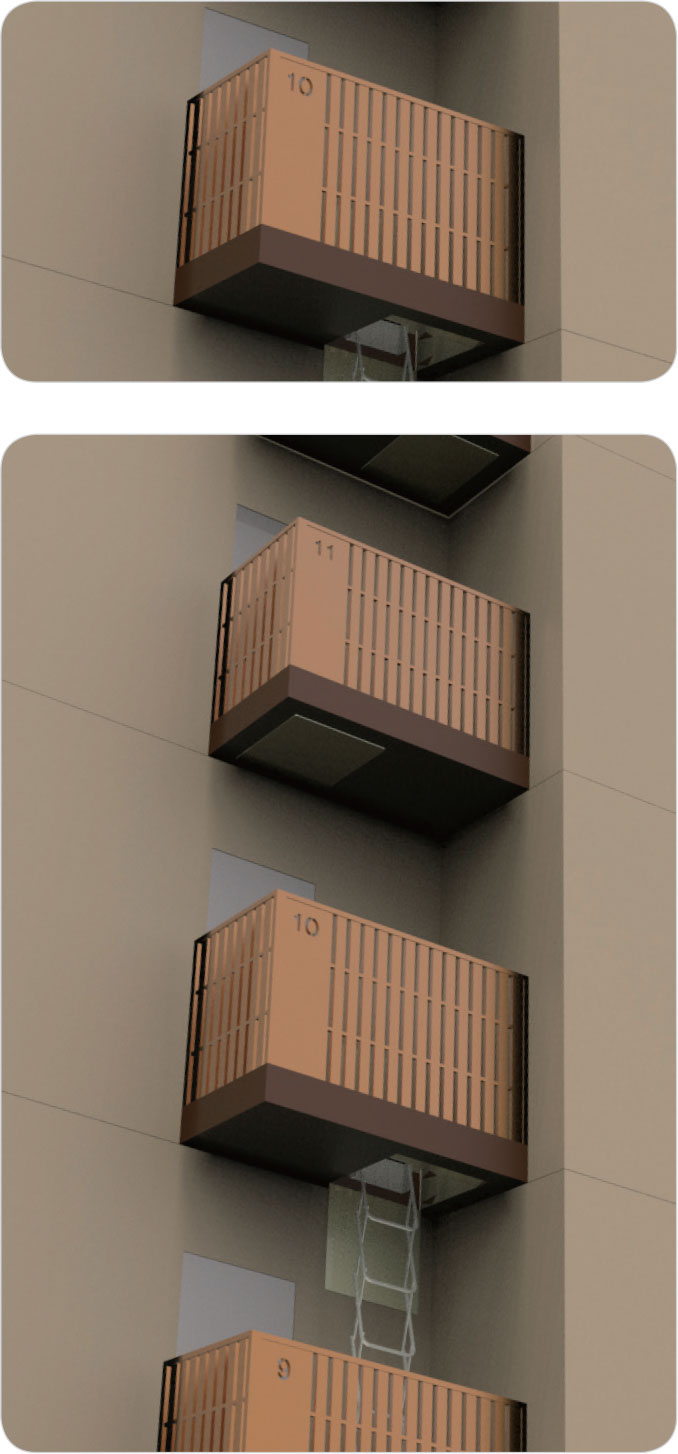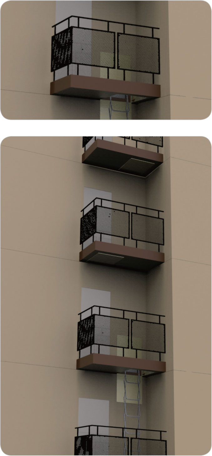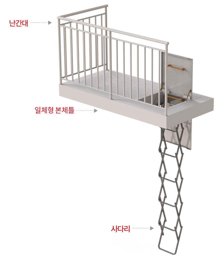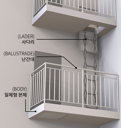 • 아파트 외벽에 설치하는 탈출형 대피시설로 탑재된 내림사다리를 통해 아래층 또는 지상까지 피난 (탈출형 대피)