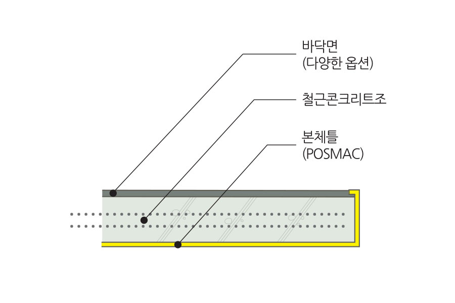• 본체틀을 바닥 슬라브에 연장하여 배근 콘크리트 타설