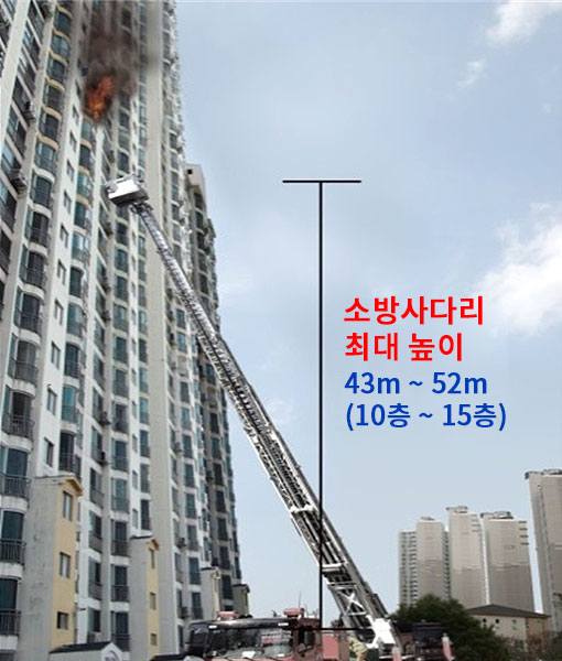 • 15층 이상 화재시 소방사다리 구조 어려움 (초고층아파트 건축 추세)